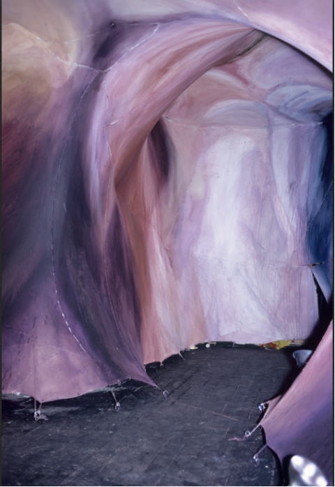 Throughout my 1,500-square-foot studio in downtown Providence, I hung, stretched, and sewed canvas into a tensile structure, and painted the inside in pulpy, watery pinks and blues and bloodied reds. I titled my first sculptureTent (Fig. 2). My all white, male, RISD Senior Thesis Committee nicknamed it A Womb with a View. It was my own Womanhouse, but I was unaware of what Judy Chicago [b. 1939] and Miriam Schapiro [1923–2015] were doing across the country at California State University in 1972, the same moment in time.
