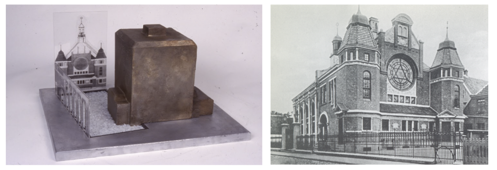 MP: It took me twelve years to go back to Emden again. And that’s when I got the idea to create a Holocaust memorial where both Jewish and German records were housed in the same location. The metaphor of the ghostly was important in my Emden Holocaust Memorial, Reclaimed Site; Bahnhofsbunker Projekt (1997–98; Figs. 17–18). It’s a monumental shimmering ghost of the Emden Synagogue transposed against a monolithic concrete air-raid bunker, the Bahnhofsbunker (or train station bunker). The front and left walls are photo-etched glass with the historical image of the synagogue being burned on Kristallnacht, the night of broken glass (November 8, 1938). The Bahnhofsbunker would become an International Research Center housing Emden’s Jewish and German records together. This had never historically been done in Emden or anywhere in Germany, for that matter. My sense of having a merged identity, German and Jewish, and the traumatic experience I mentioned earlier, inspired me to conceptualize this strategy.