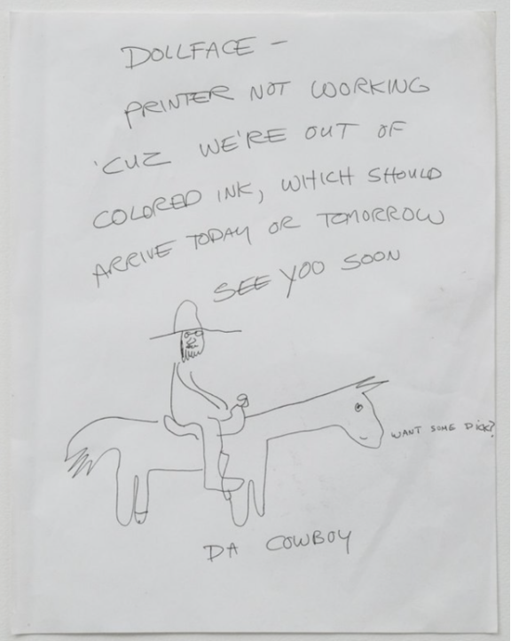 MP: It’s more emotional and humorous at the same time. As with the argon signs, I wasn’t thinking of language in the letters. They were simply fleshing out the memorials by expanding the narrative. My mother was nasty and accusatory; the Cowboy was an excellent cartoonist with a wonderful sense of humor. I use the handwriting in their letters to create the argon signs as the titles for the pieces.