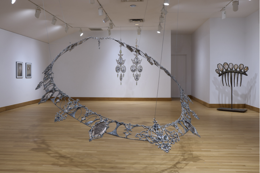 As models for this over-scaled jewelry, I researched the European genre of cut steel and Berlin iron jewelry (1804–1918). Manufactured during the German industrial revolution, this jewelry became a symbol not only of patriotism and loyalty but a signifier of women who sacrificed for the “Fatherland.” Twice in Germany’s wartime history, aristocratic German women were ‘urged’ to give their jewels to the war effort in exchange for a less expensive form of adornment. Iron and steel were not gold and diamonds.