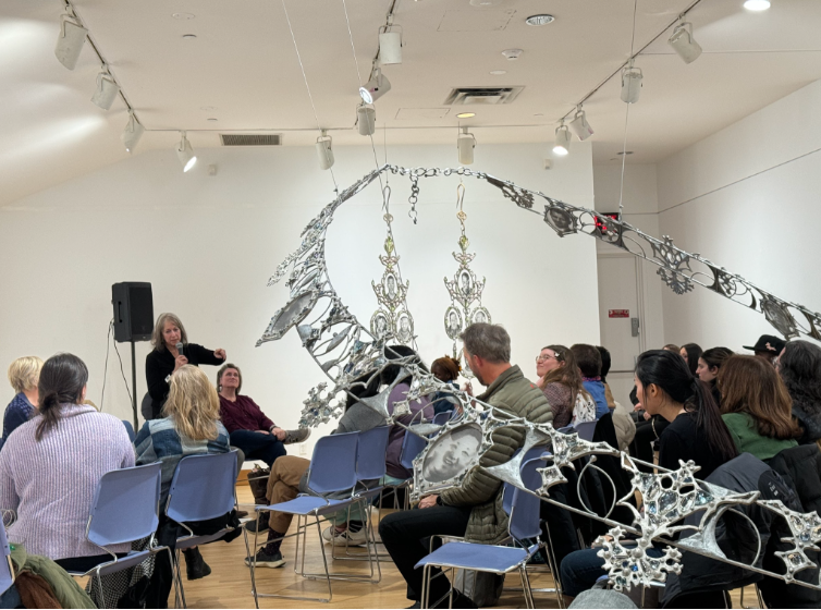 SW: It was imposing to have this thing suspended above you, and you could see it on the faces of some of the students. That they were kind of awkward or vulnerable. We both felt very anxious about the presentation, because of this understanding that we might live in a bubble, but we don’t work in a bubble. We can see into this other bubble, and we must engage with it. There was something very powerful about our collective proximity to this work that was both delicately beautiful and menacing. What was important to you about this event?
