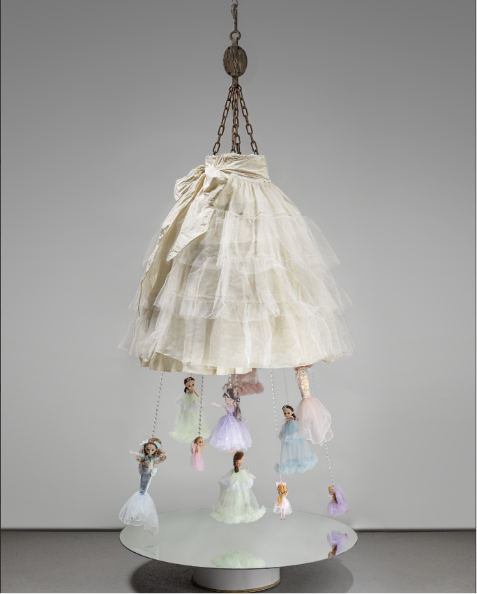 I soon envisioned the white shape of the petticoat as the flayed blue cloak of the Madonna. In the painting, the Madonna is shielding the people with her cloak. I decided little girls should be protected under the petticoat. That Christmas, I came across the perfect dolls for the sculpture at my favorite neighborhood 99 cent store right down the street. I previously had dozens of Barbies hanging under it. My Barbies were white, so my friends urged me to buy a politically correct mélange of Black, brown, and Asian Barbies. But the Barbies were a loaded signifier that was taking the piece in the wrong direction.