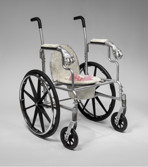 While working on the Madonnas I kind of fell apart. My right hand was swollen and misshaped from decades of abuse in the studio. I was in tremendous pain and couldn’t work. (I remember what Louise’s [Bourgeois] hands looked like in her old age). I had to have an operation on my right hand. Soon after, I had a hip replacement and, most recently, I had spine surgery. This was the impetus for Madonna il Invecchiamento (2020–23; Fig. 31), which translates as “aging,” becoming “old,” or “worn out.” I assembled the hospital equipment I had acquired in the loft: a wheelchair and a porta-potty, which was later covered in deer hide. I dreamt of deconstructing these symbols—of being an invalid and welding them together to create a new dual-functioning contraption. My friends convinced me to cast my hands before I had the operation, which I did in aluminum. Before my hip replacement, I also cast a pink glass coccyx. This surreal hybrid was an apparatus that also became an anthropomorphic body. When you’re sick, you realize how much your body is a machine that isn’t functioning properly.