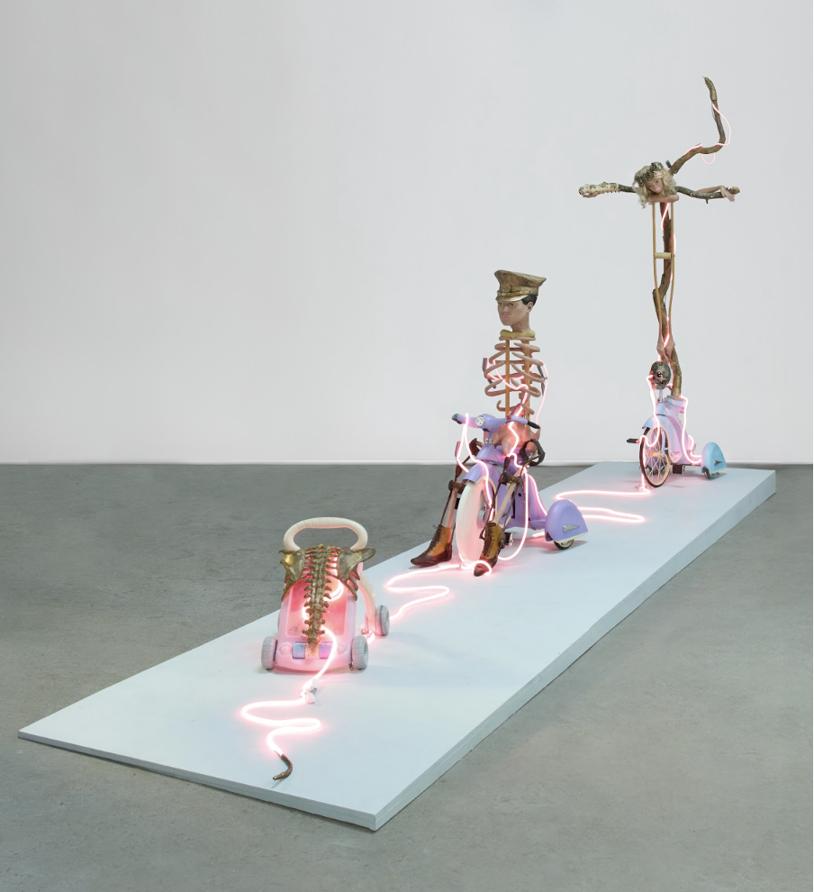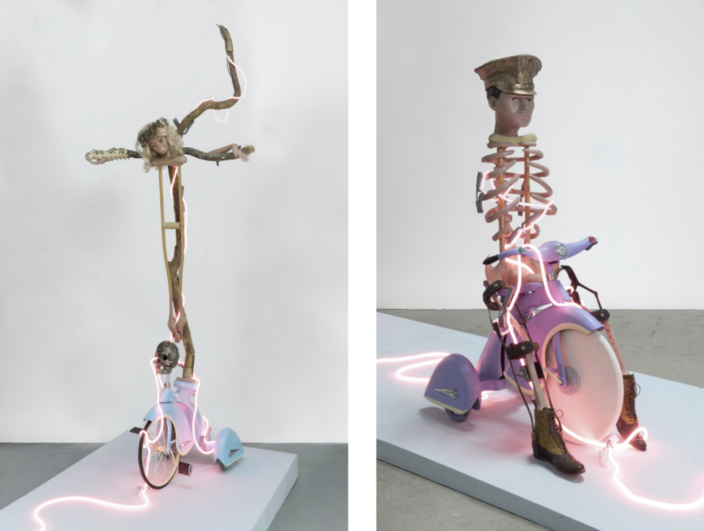 Since Trump was elected again, I keep having apocalyptic nightmares. I’m not certain how this relates, but I needed to crucify Barbie. It seemed a fitting motif. After I crucified her on the tricycle with a bronze crown of thorns, friends of mine found me a newer tricycle in a Pittsburgh antique store, so I started to conjure Ken (Fig. 34). He needed his own crown, so I cast the bronze Hitler hat from the uniform I wore in the photograph. Barbie and Ken conceived a child of indeterminate sexual orientation. During the fabrication of this piece, I had that spine surgery, so I cast a bronze rib cage with a prominent spine for their offspring (see Fig. 33).